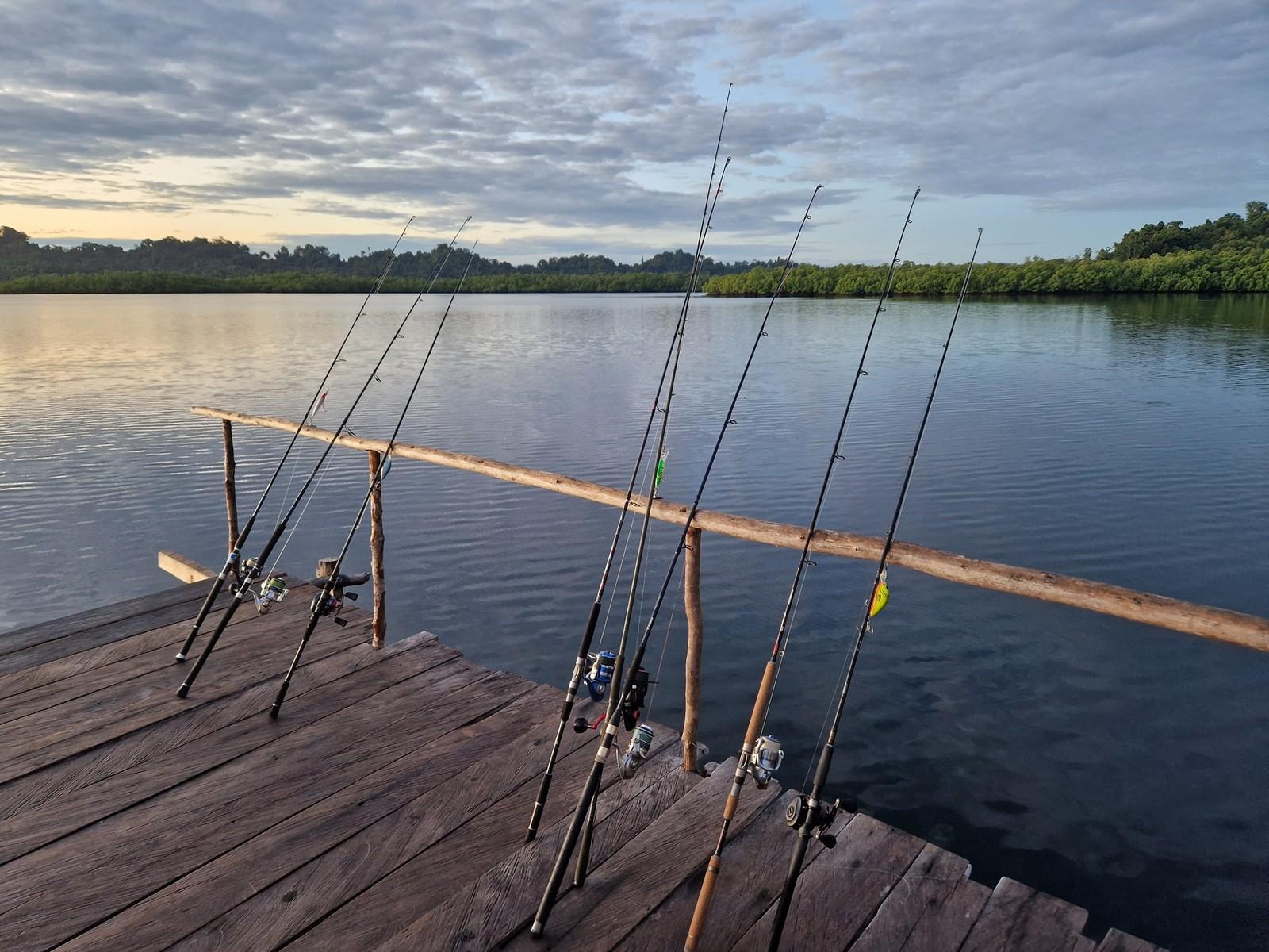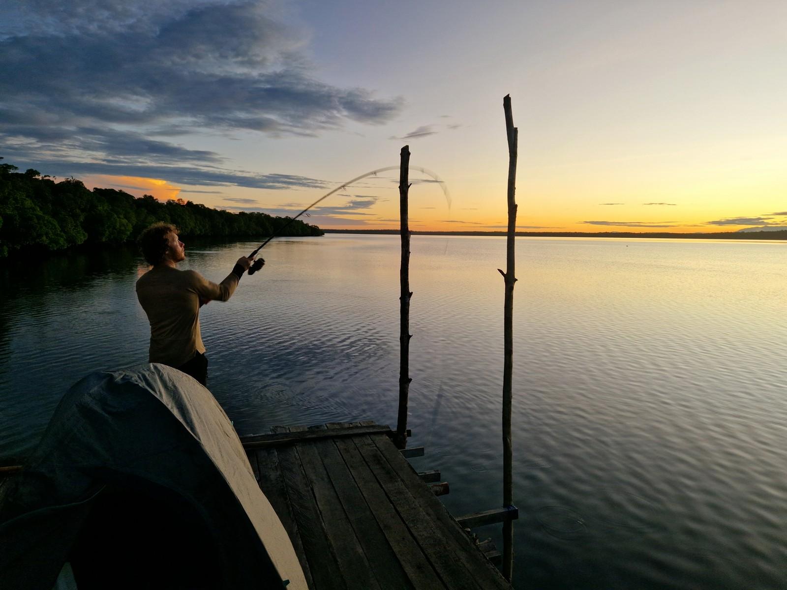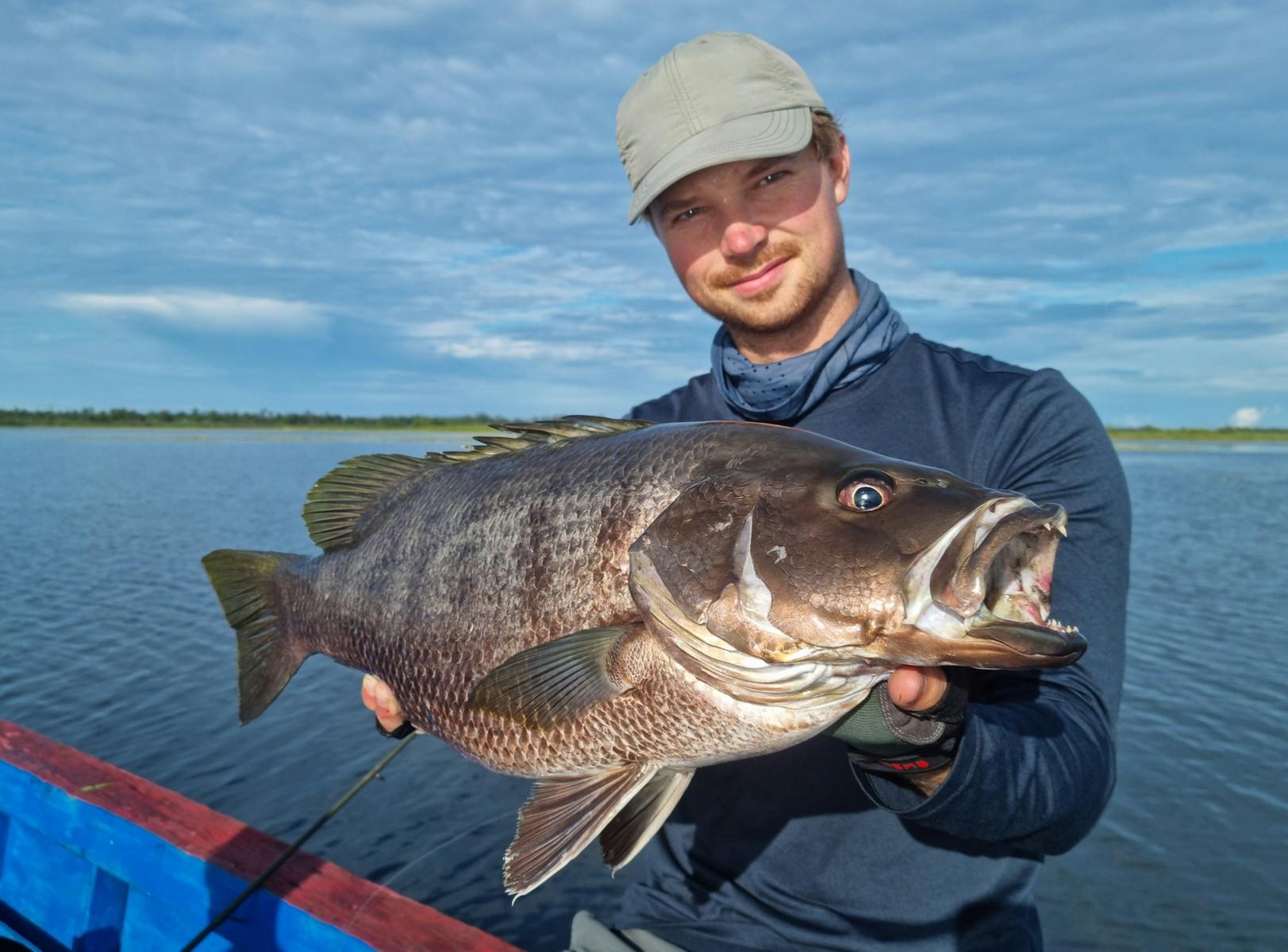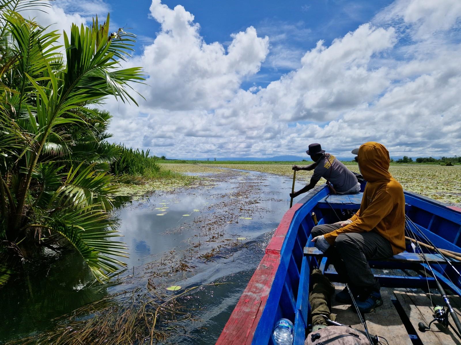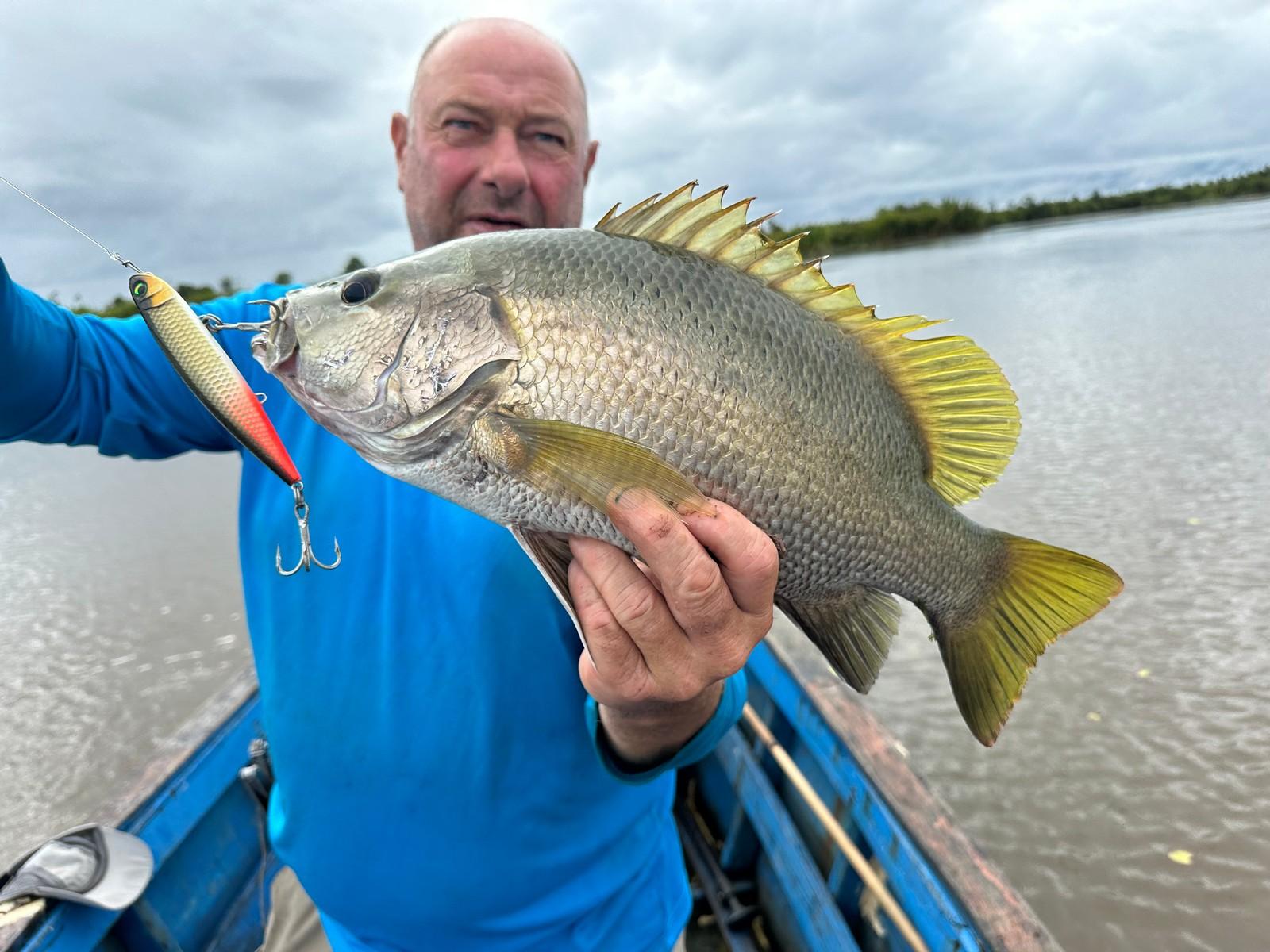 Maar ook hier kan de visserij soms taai zijn en moet je het met een enkele aanbeet doen op een ochtend/middag. Op de meren kun je wat ‘lichter’ vissen, zonder de slip helemaal dicht te draaien. Als een Papuan bass zich toch vastzwemt in een dik wierbed dan krijg je die daar met beleid meestal wel uit.