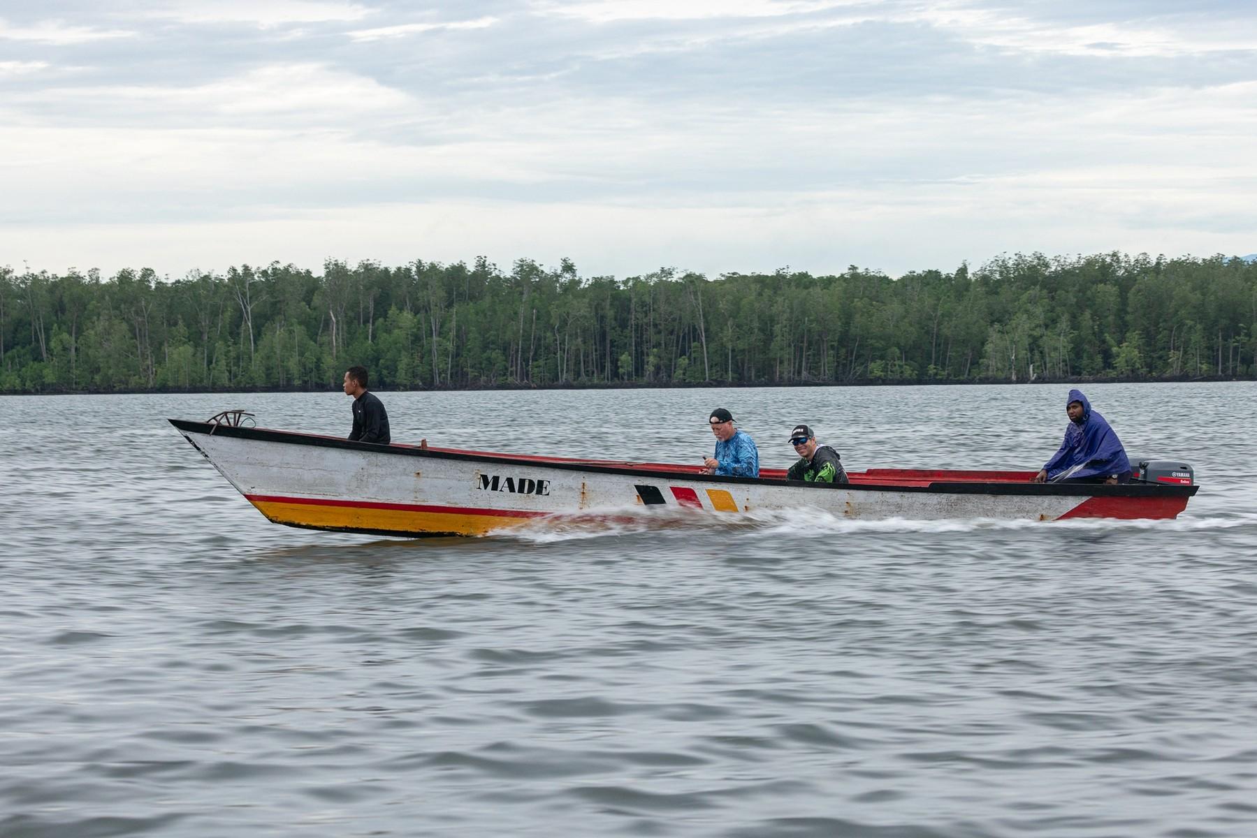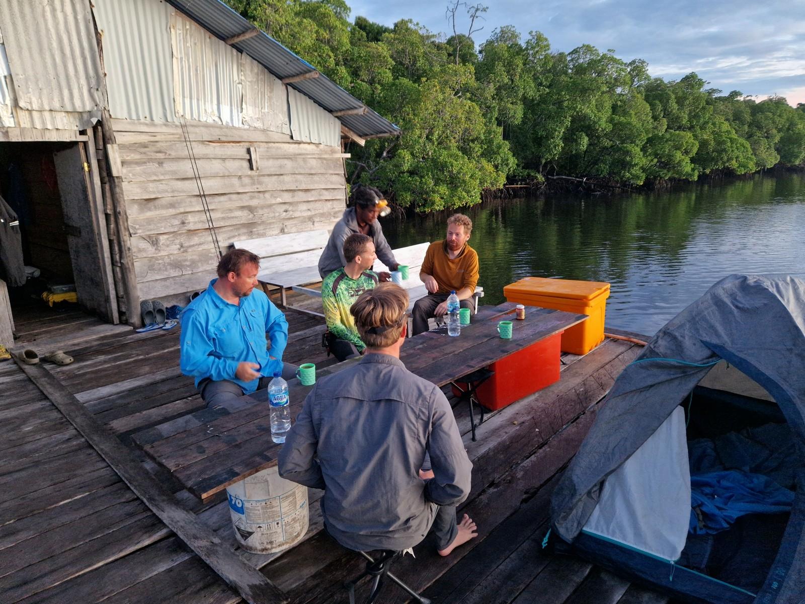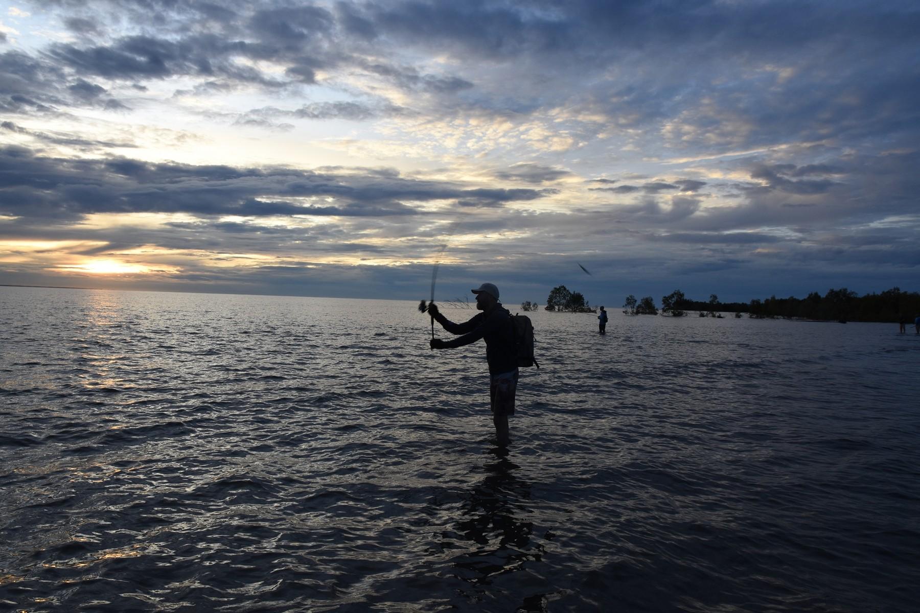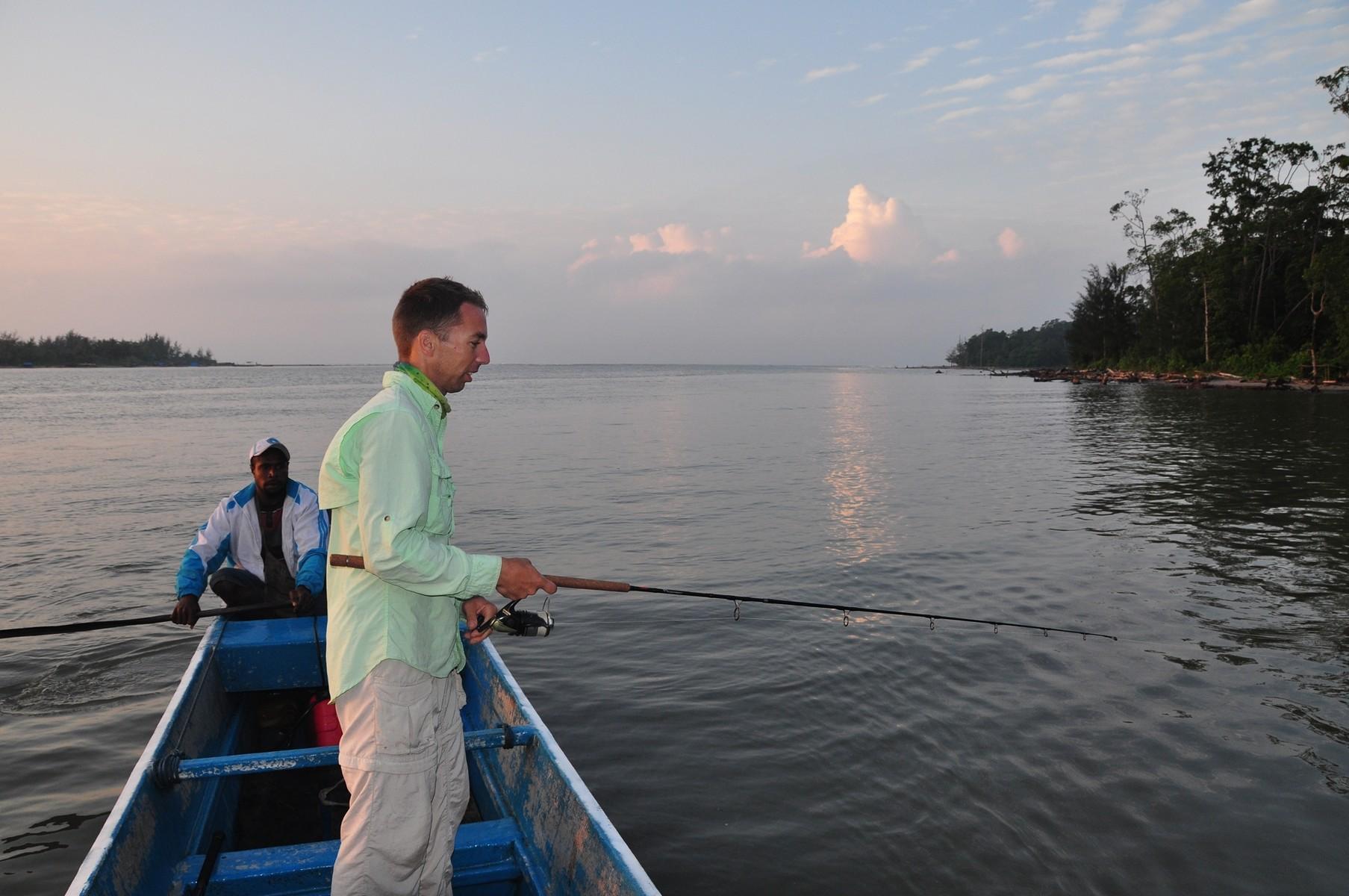 Het gebied waar we op barramundi vissen ligt aan de zuidkust van Papua en wordt gekenmerkt door ondiep water (1 tot 3-4 meter) met zandbanken en eilanden met soms behoorlijk wat stroming (afhankelijk van het getij). Vissen gebeurt hoofdzakelijk vanaf de kant, wadend in ondiep water, rond het eiland waar we kamperen of andere zandbanken/-eilanden. Zoutwaterkrokodillen komen in dit gebied gek genoeg niet voor. Omdat je vanaf het eiland kunt vissen, kun je dus zo je hengel pakken en gaan vissen, nog voor het ontbijt klaar is (als het tij goed is tenminste). De twee boten die mee zijn worden ook gebruikt om vanuit te vissen. Op barramundi, maar zeker ook voor queenfish die vaak wat verder uit de kant zitten.