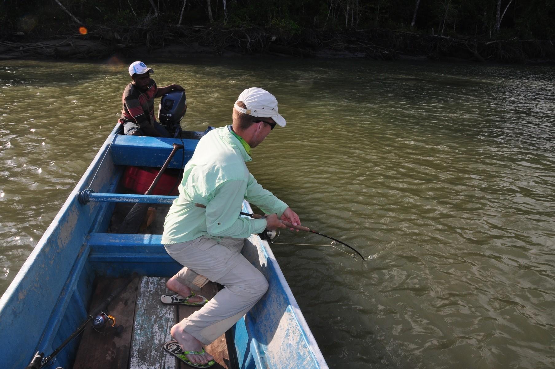 De riviervisserij concentreert zich meestal op stekken met veel obstakels, meest takken/bomen die (deels) onderwater liggen. Een gehaakte Papuan bass, groot of klein, zal direct terug willen naar die obstakels. Dat vraagt om zwaar materiaal met vrijwel dichtgedraaide slip om de vis geen meter te gunnen. Op de stukken rivier met getijdenwerking zijn de uren rond het keren van het tij vaak het beste. De visserij kan behoorlijk taai zijn, zeker wanneer het water erg troebel is door regenval. Maar je kunt ook zomaar meerdere aanbeten krijgen in een paar uur vissen.