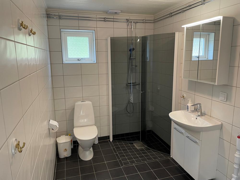 Rättarebostaden Deze schitterende woning beschikt over 170 M2 en biedt plaats aan 12 personen. Ideaal voor 2 of 3 families of een eigen visclub. Het ligt vlak bij de receptie en heeft 2 verdiepingen, 7 slaapkamers, ruime woonkamer, een keuken met koelkast en vriezer, magnetron en vaatwasser, 3 badkamers elk met douche / toilet en houtkachel in de woonkamer als ook een TV met DVD en radio. In de kelder is een sauna, wasmachine en droger. Het terras is 15 m2 en beschikt over tuinmeubilair en een BBQ plaats. Er is een privé aanlegsteiger bij het meer.