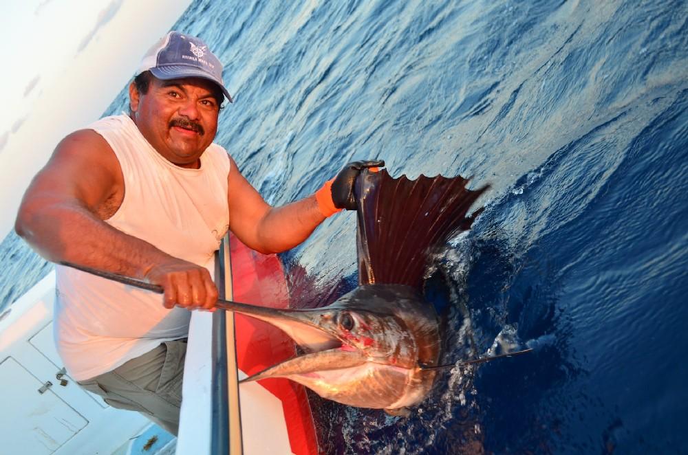 Vanaf maart tm juli kun je hier ook regelmatig zeilvissen tegenkomen, waarop dan ook vaak de focus ligt bij de lokale vissers, maar vergeet ook vooral niet de marlijn, dorado, en zwartvin tonijn die in deze periode ook hun piekmoment hebben. Dat kan zowel trollend met kunstaas of natuurlijk aas maar soms ook zelfs op poppers of stickbaits. Voor de visserij hier geldt dat je voor het jiggen een 100 – 300 grams korte boothengel van 1.8 meter gebruikt met een molen uit de 5 a 6000 serie die snel is in het opdraaien (1 meter per slag minimaal) in combinatie met een 30 kilo dyneema lijn en 80-100 lbs fluo onderlijn. Voor het trollen gebruik je een 20-30 lbs boothengel met dito molen als voor het jiggen en voor het popperen een 2,4 tot 2,7 meter lange popper hengel van 100 tot 150 gram. Je kan hier overigens ook je hengelmateriaal huren en dat kost 30 euro per persoon per dag waarbij verloren gegaan (kunst)aas vergoed dient te worden.
