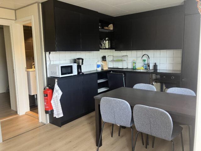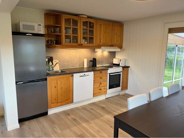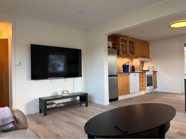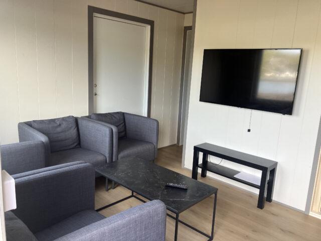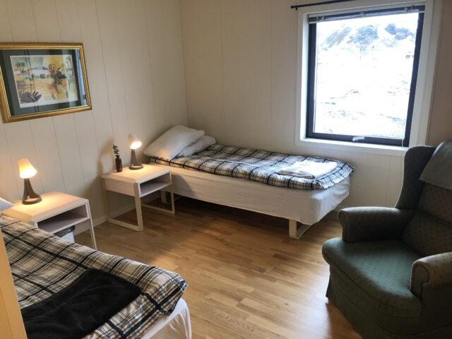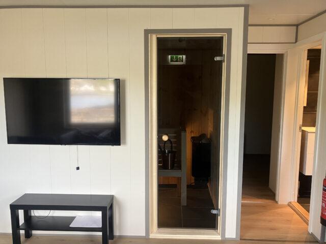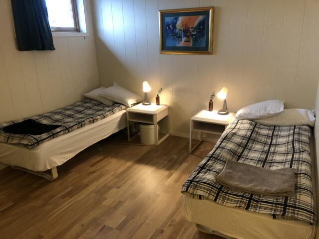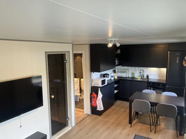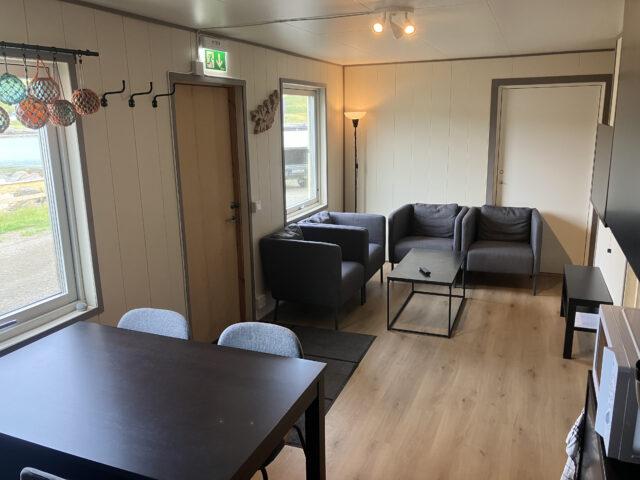 Aan de lange zijde van het hoofdgebouw zijn twee vierpersoonsappartementen met allebei een aparte ingang gebouwd. De woningen zijn compact maar slim ingedeeld. Op 34 m2 heb je plek voor vier personen voor een tv waar je verbinding mee kunt maken via chromecast. Je hebt een kleine sauna, WC en douche. De keuken is voorzien met alles wat je nodig hebt en een keukentafel waar je kan eten en natuurlijk je spullen kan optuigen om te vissen. Er zijn twee slaapkamers waarin elk een ruim Noors stapelbed is geplaatst.